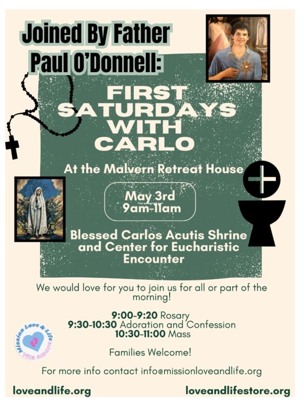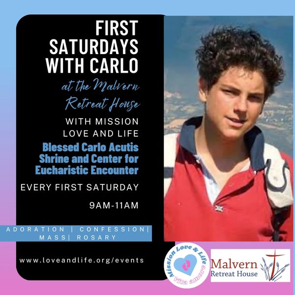 Join us each first Saturday from 9am-11am at the Malvern Retreat House's Blessed Carlo Acutis Shrine and Center for Eucharistic Encounter for a peaceful morning of adoration, confessions, mass, and rosary.